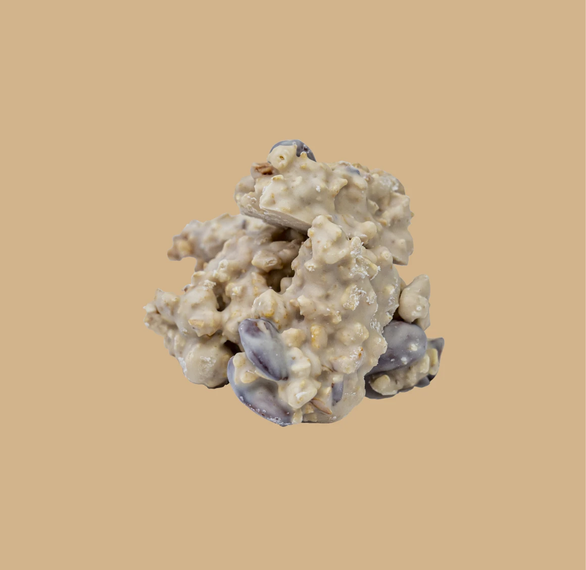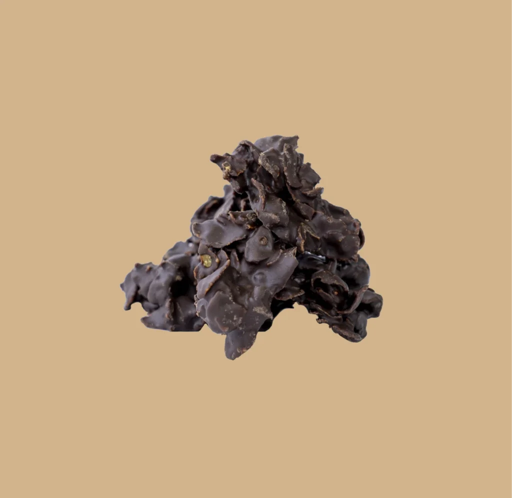 Rochedos de chocolate branco – amêndoas e granola – um sabor suave, equilibrado e uma textura crocante.