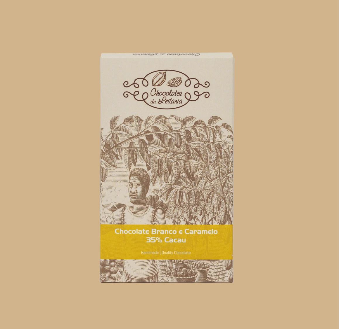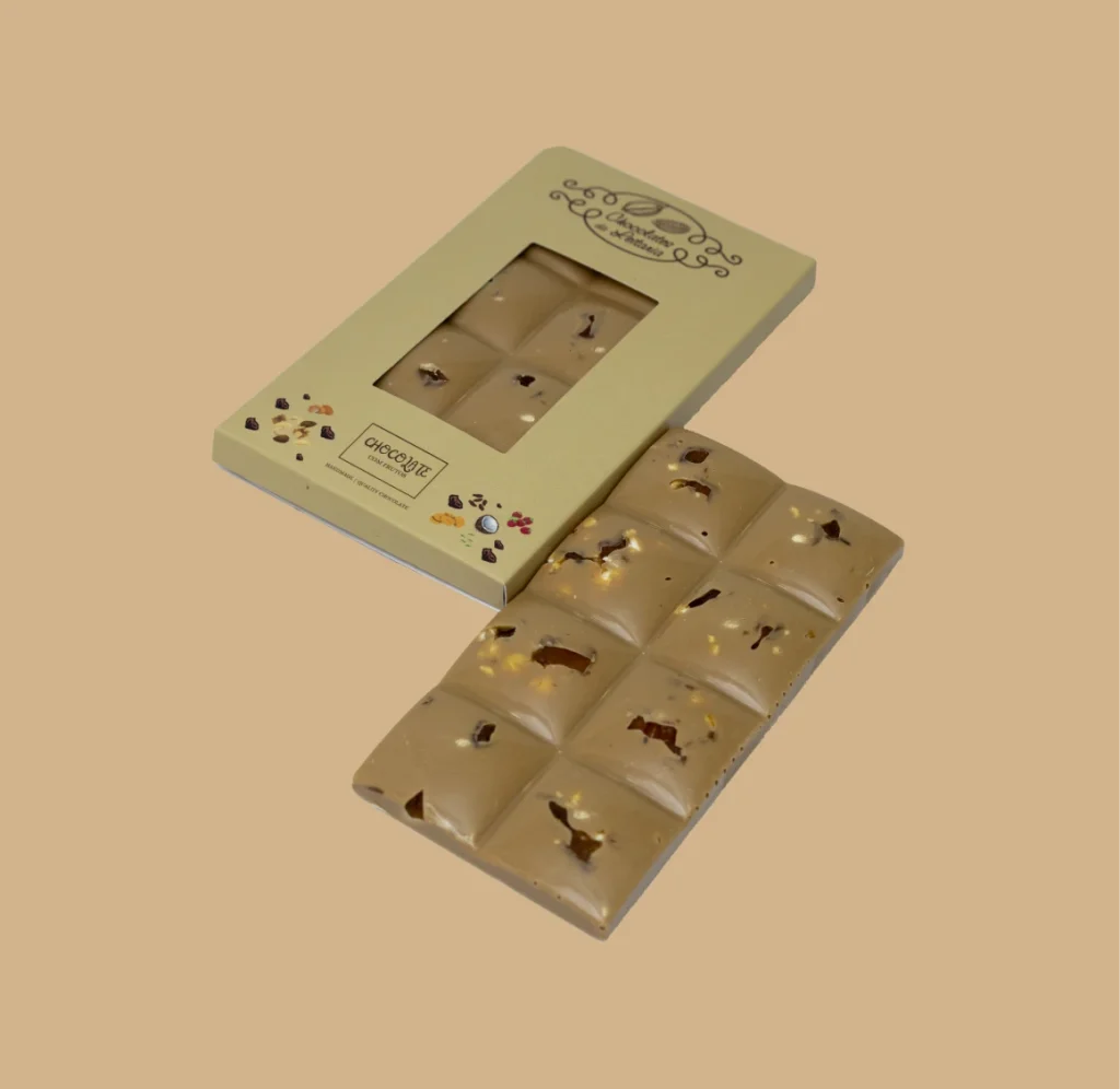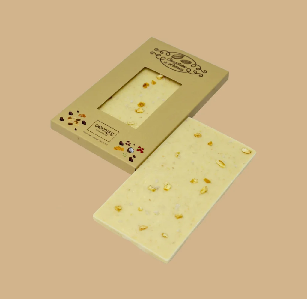 Tablete de chocolate Branco e Caramelo – um sabor suave, equilibrado e uma textura cremosa.