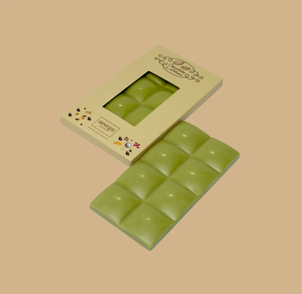 Tablete de chocolate branco 30% cacau – Matcha – Cremoso e aromático, com um toque herbal do chá verde japonês.
