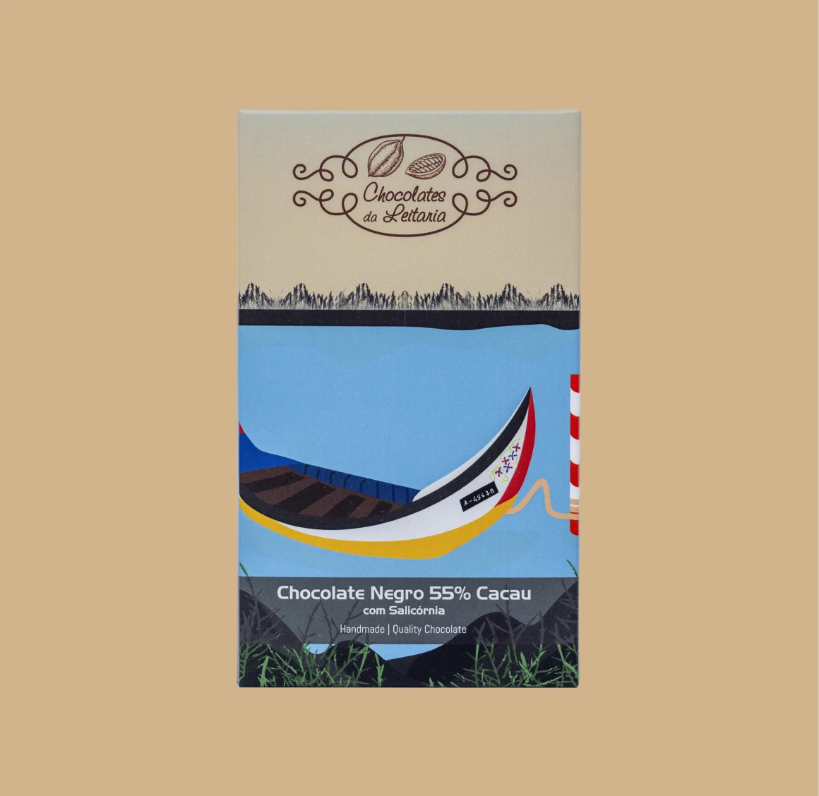 Tablete de chocolate Negro 60% cacau e Salicórnia da Ria – Uma tablete com um toque salgado sem usar sal, mas sim com um substituto dele. A salicórnia acaba por dar a tablete um sabor e um aspeto visual invulgar.