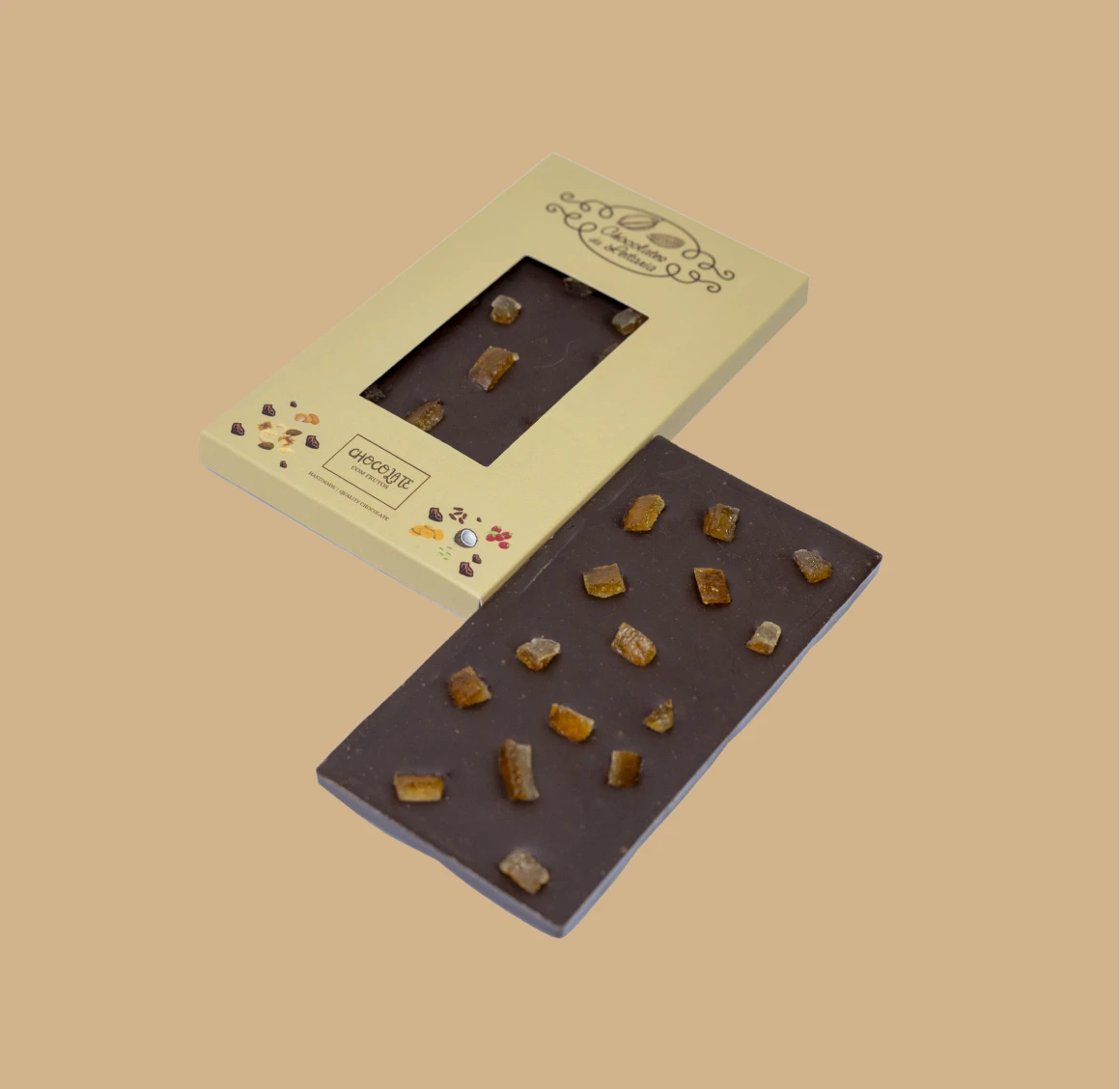 Tablete de Chocolate negro, hortelã e laranja confitada